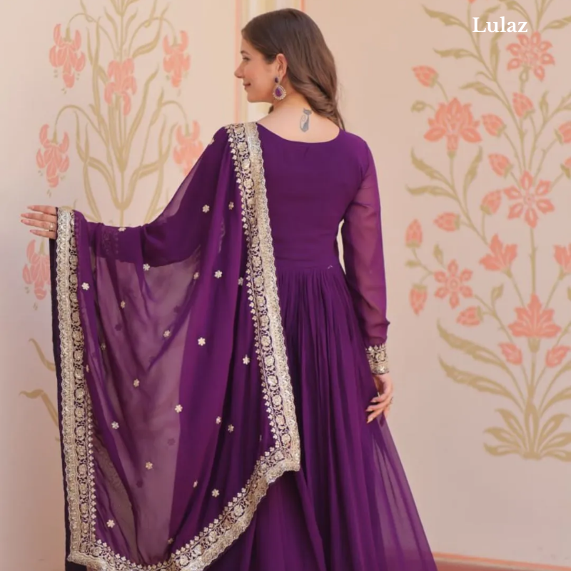 Purple georgette gown with zari & sequins embroidery, paired with a matching embroidered dupatta—perfect for festive occasions.